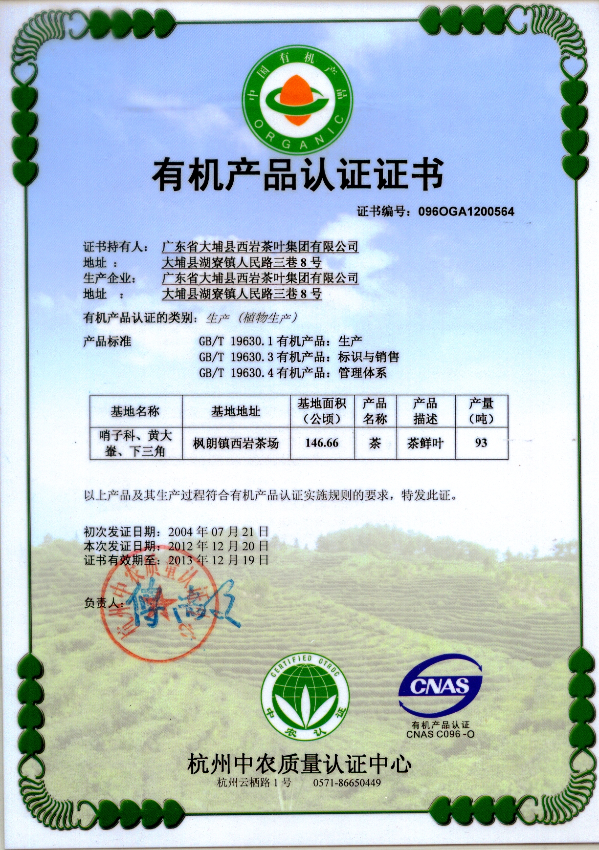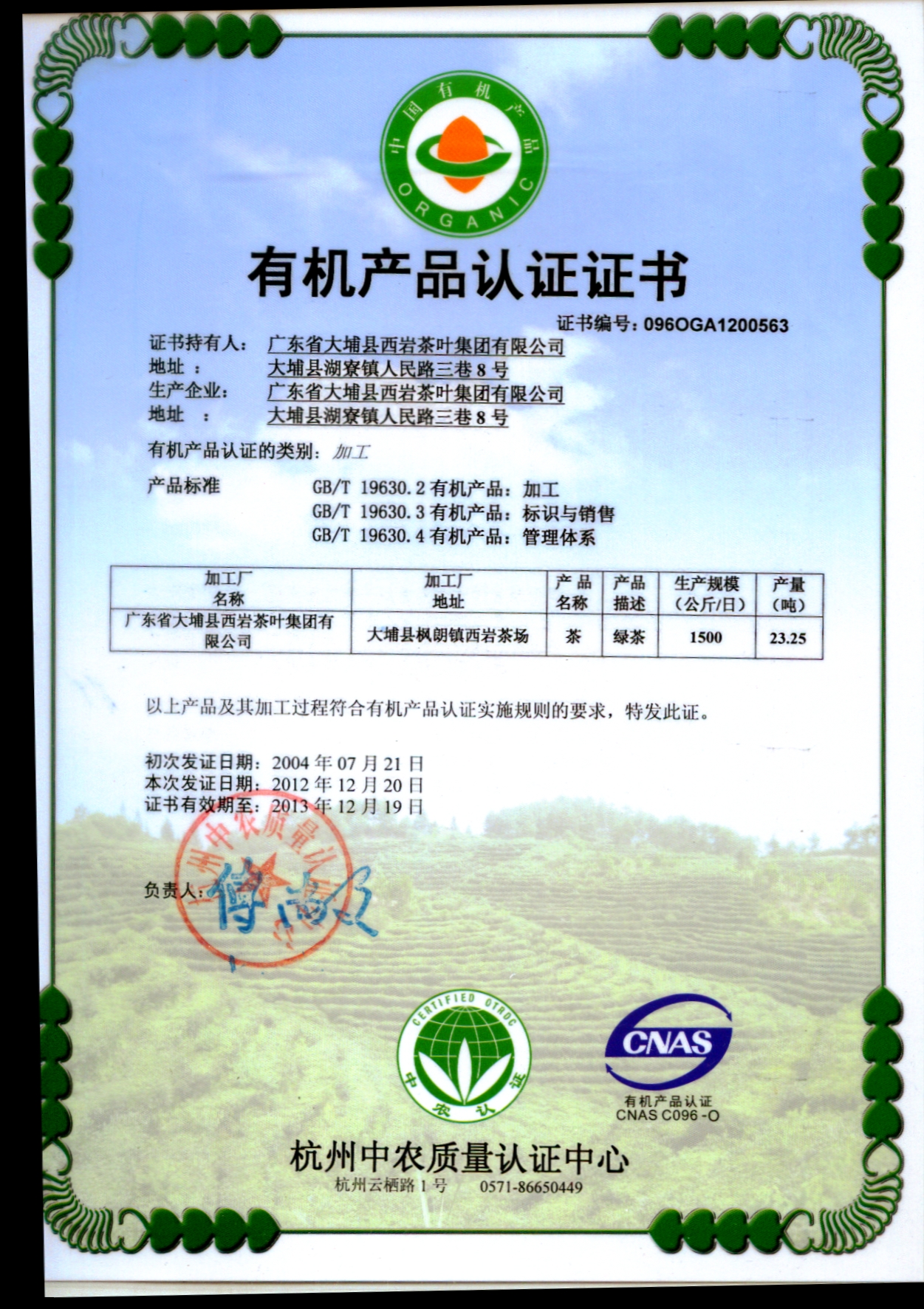 有机茶证书
